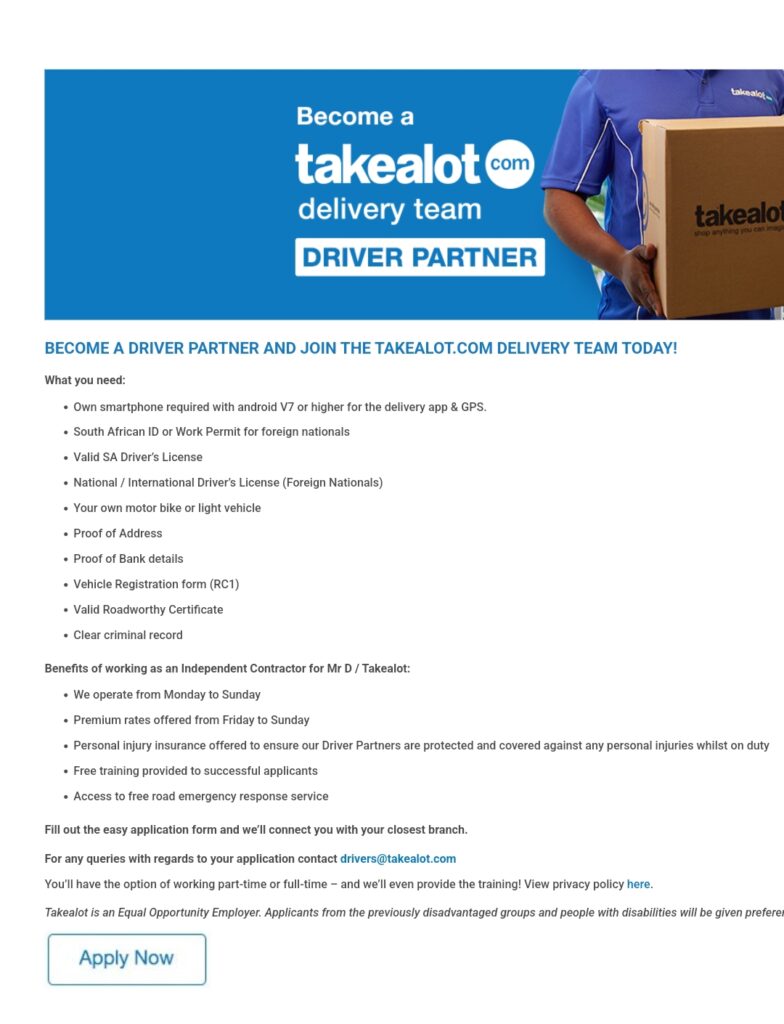 If you are interested in joining the takealot.com delivery team, then visit their website to find out more and apply online. Don’t miss this opportunity to become a driver partner and join the takealot.com delivery team today!