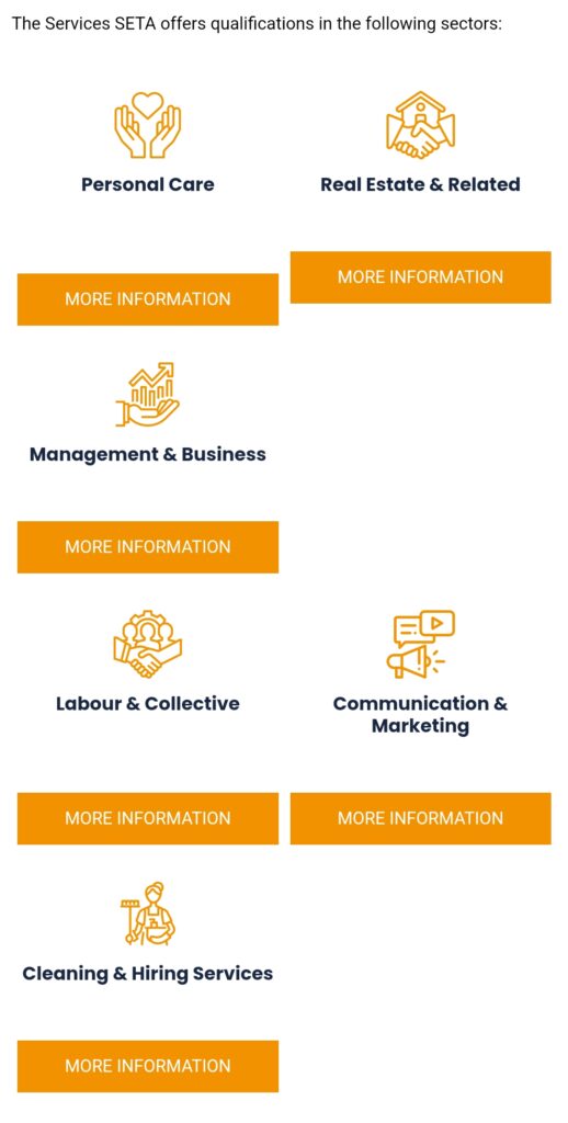 By facilitating and funding programmes that build skills-sets required by the services industries (the workplace), the Services SETA bridges the gap between formal education and training. To fulfil its functions, the Services SETA partners with public and private learning institutions to deliver the training required.